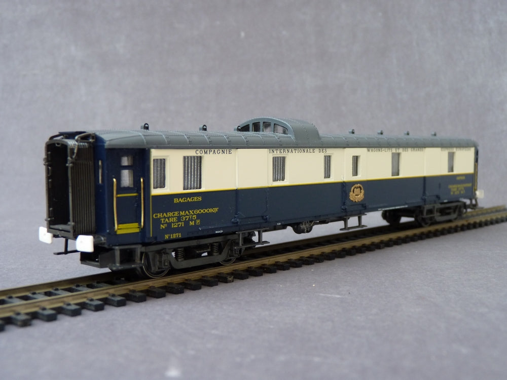 RIVAROSSI 2493 - Fourgon à bagages N°1271 M de la CIWL pour le train "Flèche d'or", couleur bleue et crème, toit gris avec vigie. Tampons blancs. Attelages à élongation et boîtiers d'attelages normalisés. Ep II et III. Ecartement HO. Fabrication italienne vers 2005.