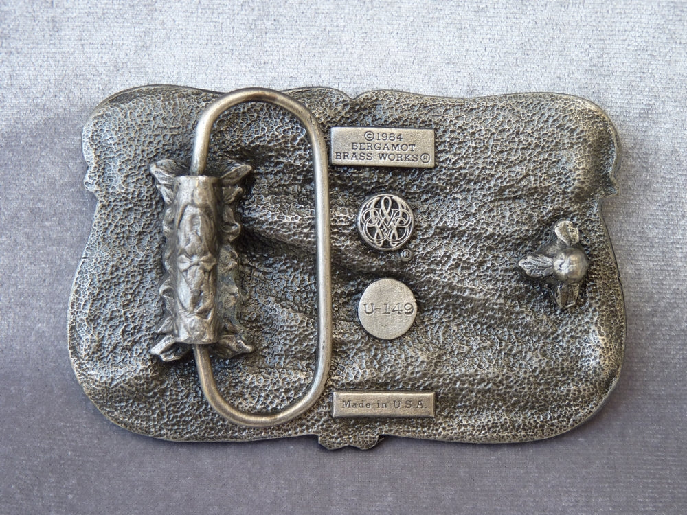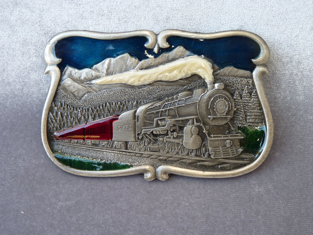 Boucle de ceinturon ferroviaire américaine - Avec motif Locomotive à vapeur type Pacific 5473. En bronze argenté moulé, émaillé et patiné. Fabrication américaine Bergamot de 1984 réf U 149.