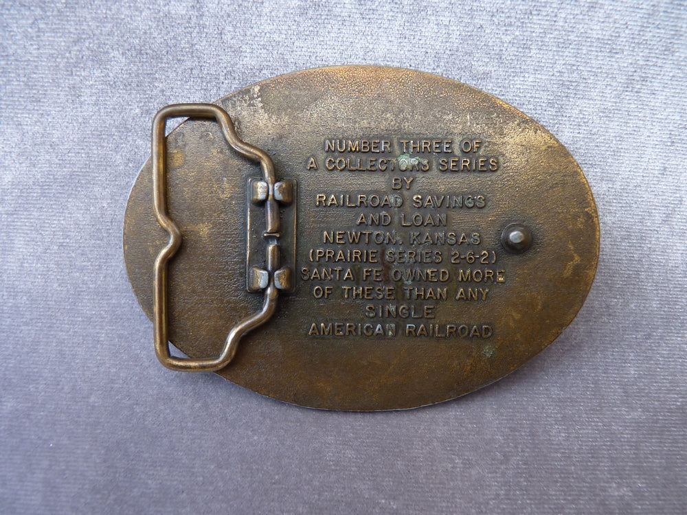 Boucle de ceinturon ferroviaire américaine - Avec motif Locomotive à vapeur "Prairies Series" 2-6-2 éditée pour RAILROAD SAVINGS AND LOAN. En métal moulé, façon vieux bronze patiné. Fabrication américaine.
