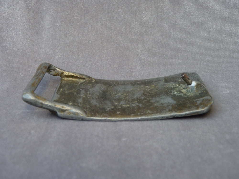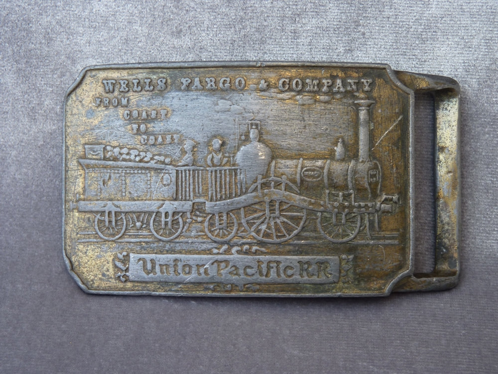 Boucle de ceinturon ferroviaire américaine "WELLS FARGO & COMPANY UNION PACIFIC RR from coast to coast". Avec motif de locomotive à vapeur primitive. En bronze moulé, vieilli et patiné. Fabrication américaine.