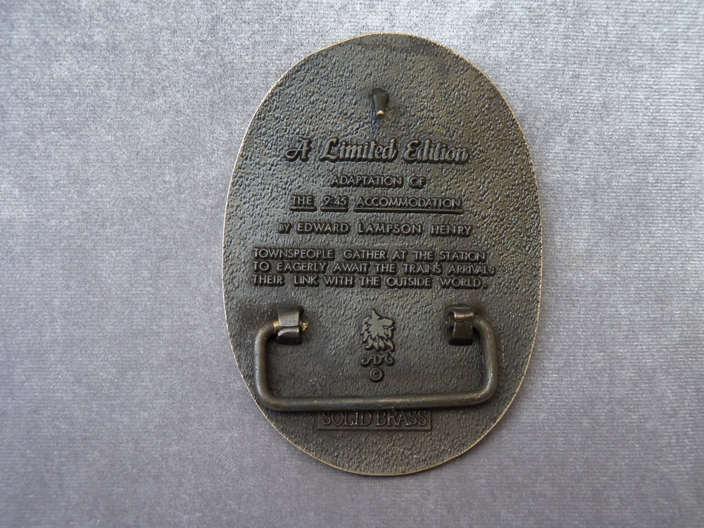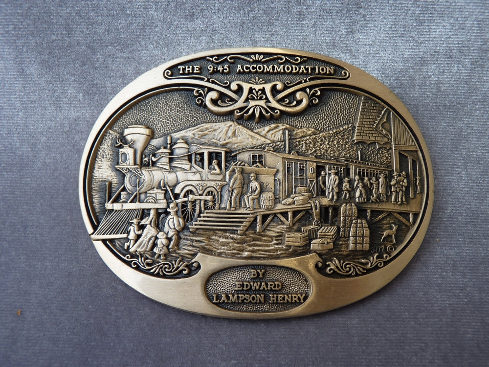 Boucle de ceinturon ferroviaire américaine "The 9:45 accommodation" by Edward Lampson Henry. Avec motif de locomotive à vapeur 4-4-0 et scène de gare Far West. En bronze moulé, argenté et patiné. Fabrication américaine.