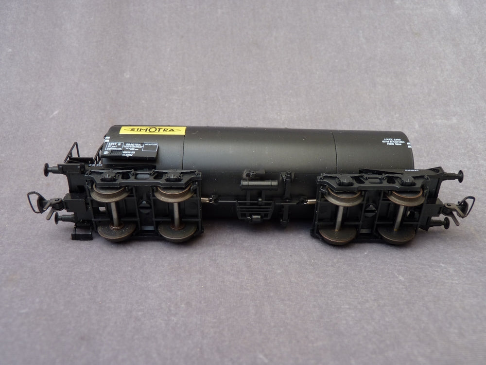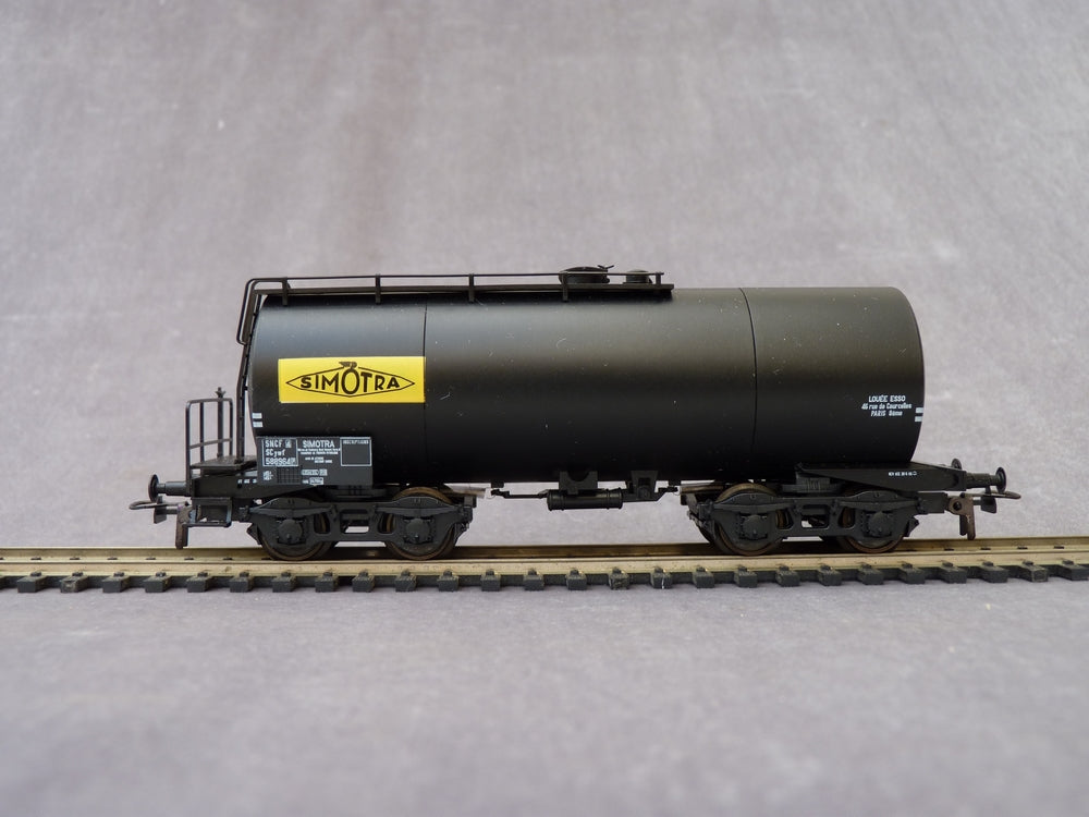 KLEIN MODELLBAHN et SAI K0505 - Wagon citerne SIMOTRA de la SNCF avec mention "Louée ESSO". Couleur noire, marquages anciens. Ecartement HO, Ep III.